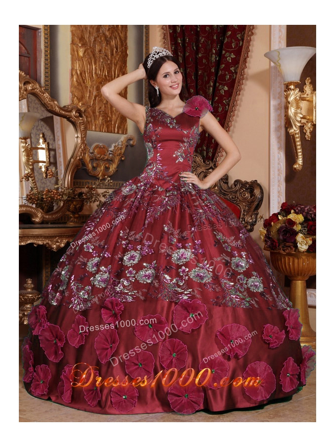 Ball Gown V-neck Beading and Appliques for Burgundy Sweet 16 Dresses