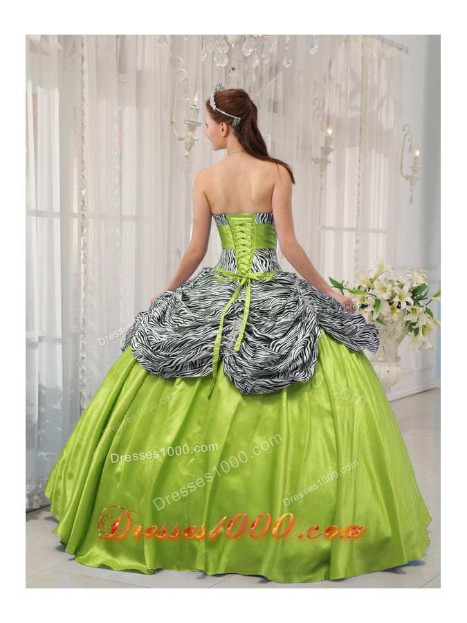 This gorgeous zebra quinceanera gall will sure be your best choice if you want be bright at the party. It features a sweetheart neckline and a wide blue band and a slim one decorated just below the bust and the hipsline to show out your curves. The gown has two tiers, the out layer is the zebra material with a lot of pick-ups. And the inner part is the taffeta as the skirt. The lace up back finishes the look.