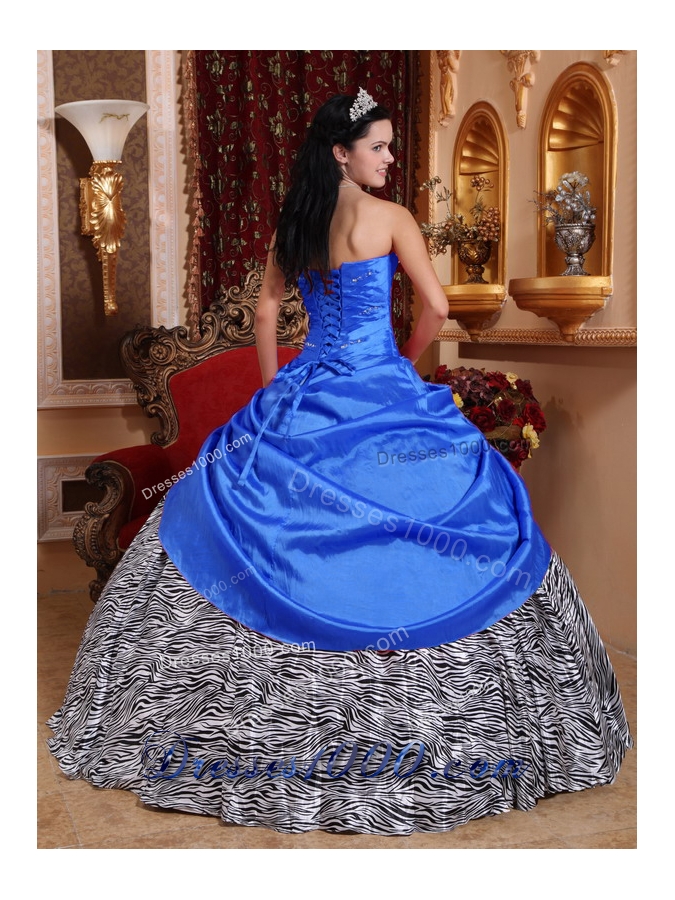 Stunning and dramatic! This hot pink, strapless quinceanera dress will make you become the spotlight in any occasion.The bocdice is accented with a sweetheart neckline and lovely beadwork.The flower decoration in the middle section is so chic that make the dress fabulous,while the zebra print skirt is simple yet gorgeous to give you sense of delicate beauty.A lace up back completes this wonderful design.