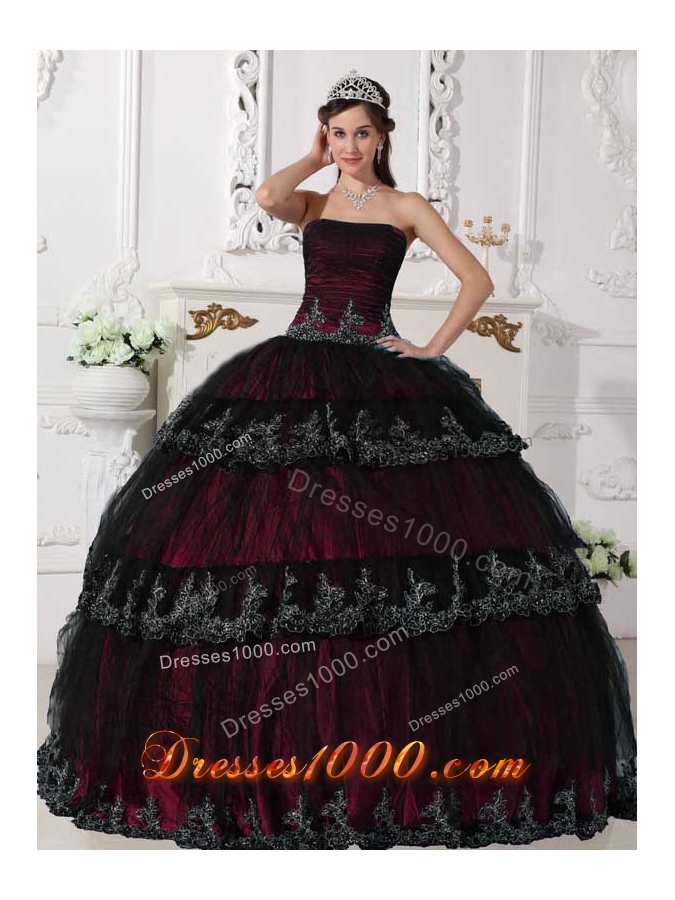 2014 Modest Puffy Strapless Appliques Quinceanera Dresses with Ruffled Layers