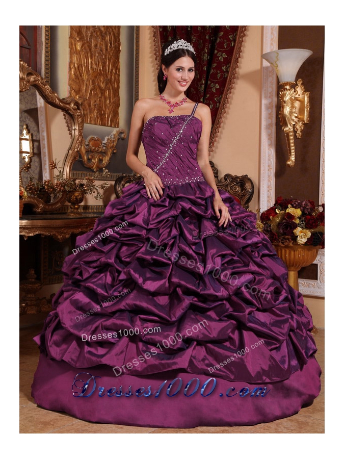 2014 Dark Purple Puffy One Shoulder Pick-ups Quinceanera Dress with Beading