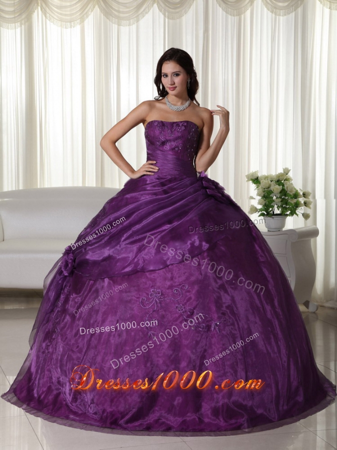 Purple Puffy Strapless 2014 Beading Quinceanera Dresses with Hand Made Flowers