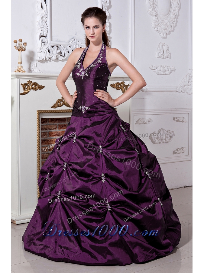 Gorgeous Eggplant Purple Princess Halter Embriodery Quinceanera Gowns with Pick-ups