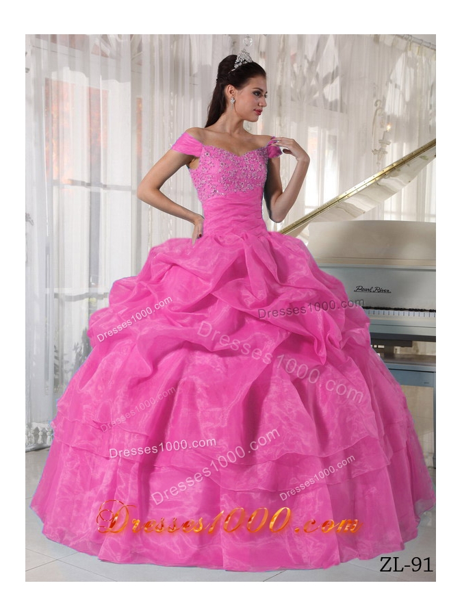 Off The Shoulder Organza Rose Pink Quinceanera Dress with Beading