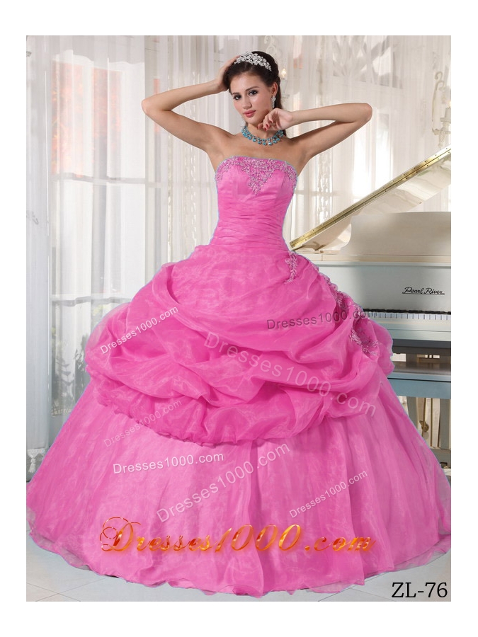 Rose Pink Strapless Organza Quinceanera Dress with Appliques and Pick-ups