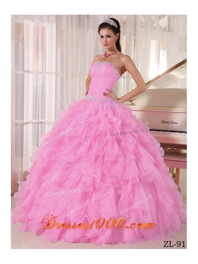 Rose Pink Strapless Organza Puffy Sweet Sixteen Dresses with Beading and Ruffles