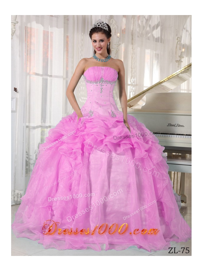 Strapless Organza Rose Pink Sweet Sixteen Dresses with Beading and Pick-ups