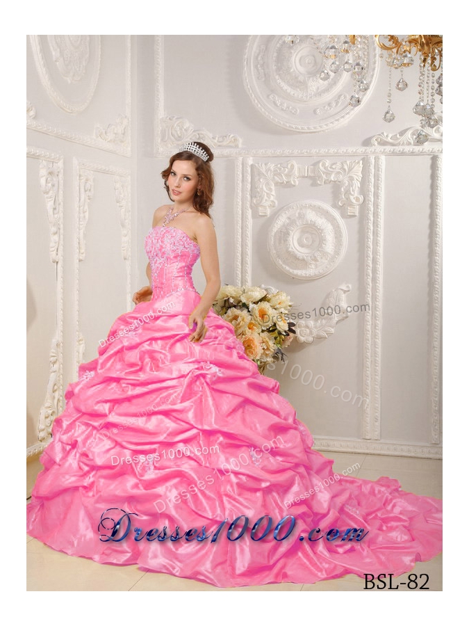 Strapless Court Train Rose Pink Quinceanera Gowns with Appliques and Pick-ups