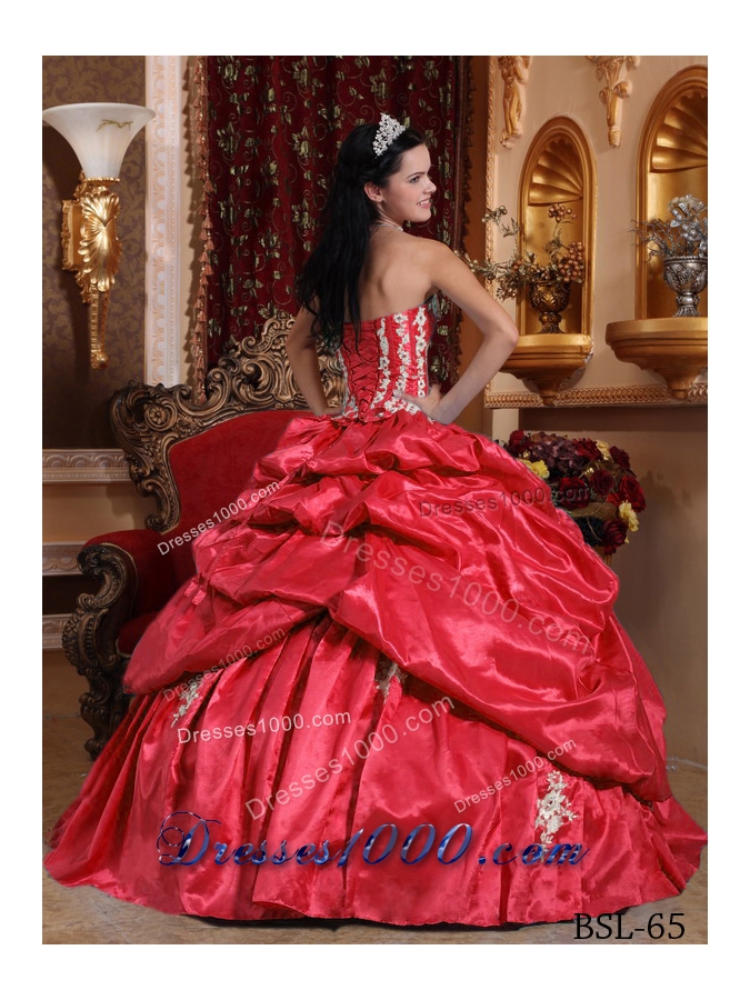 2014 Coral Red Puffy Strapless Appliques Quinceanera Dress with Pick-ups