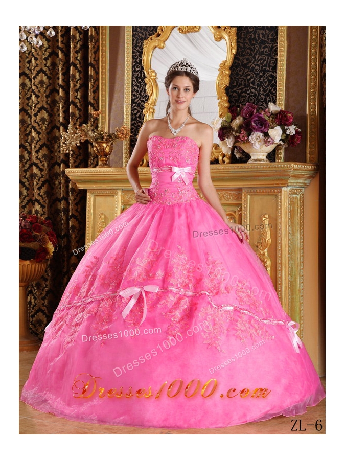 New Style Strapless Appliques Organza Rose Pink Quinceanera Gowns