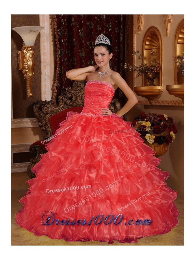 New Style Coral Red Puffy Strapless for 2014 Beading Quinceanera Dress with Ruffles