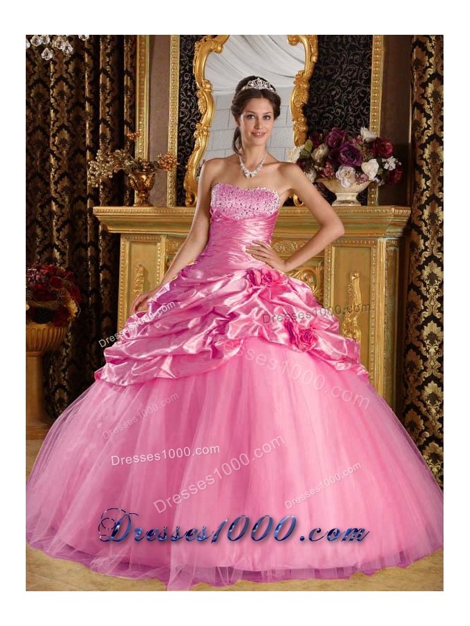 Rose Pink Princess Quinceanera Gowns with Beading and Pick-ups