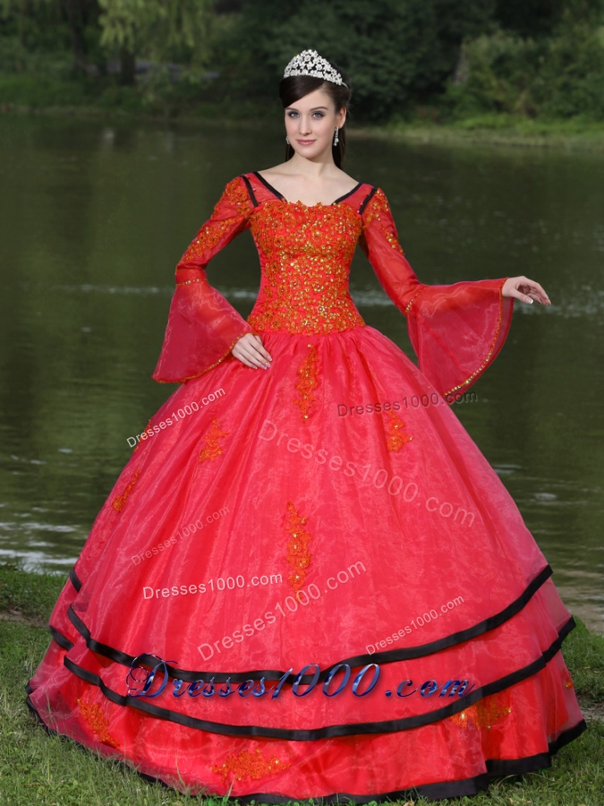 2014 The Most Popular Long Sleeves Appliques and Beading Red Quinceanera Dress With V-neck