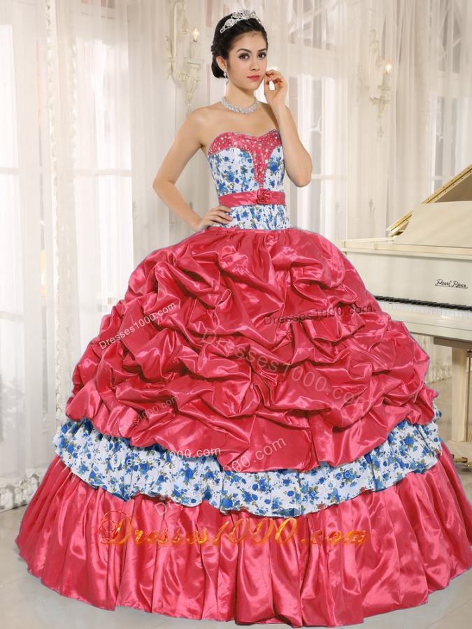 This quinceanera dress is so gorgeous, It features a beautiful strapless bodice with a sweetheart neckline and exquisite beadings. The coordinating sash with a hand flower in the center adds interests to the midsection. A bouffant gown is characterized by a shinning, puffed-out skirt often made from taffeta. The flared skirt is perfect for disguising a bottom-heavy figure. The printed fabric on the skirt looks so elegant. It can make you more charming and sexy.