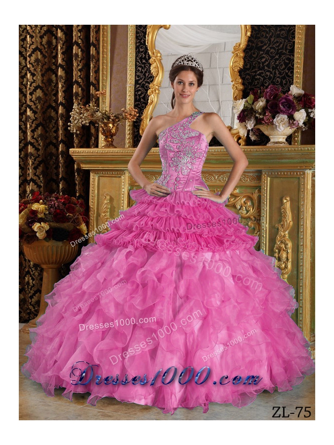 Rose Pink Princess One Shoulder Quinceanera Gowns with Appliques