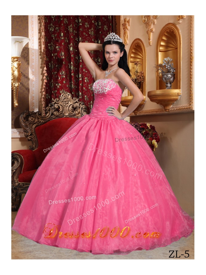 Rose Pink Strapless Organza Quinceneara Dresses with Appliques