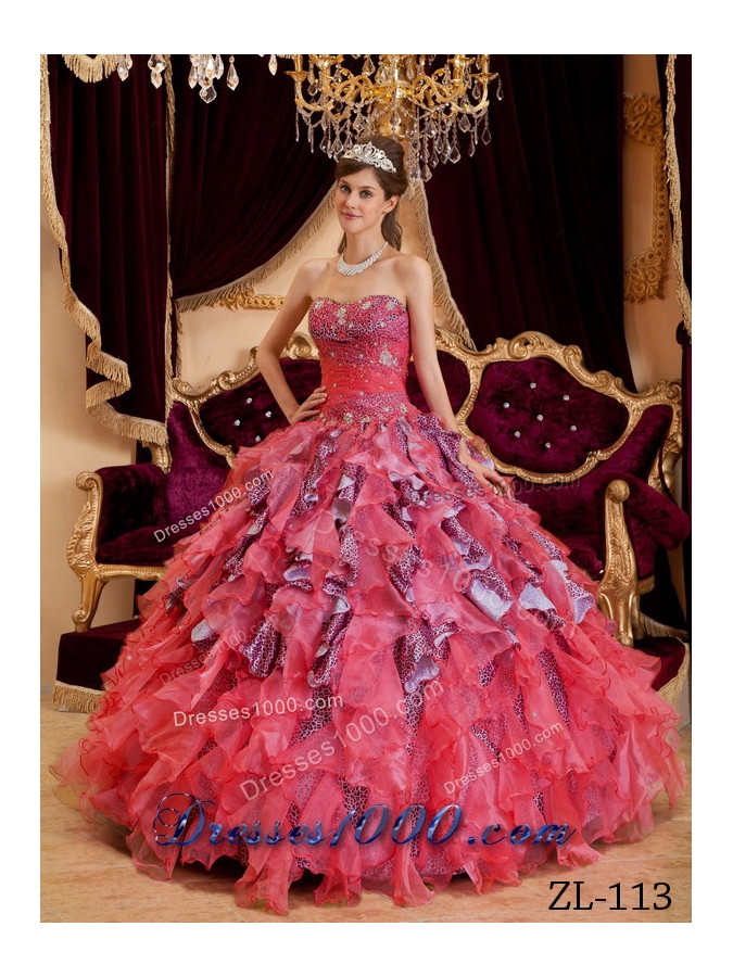 Elegant Puffy Watermelon Sweetheart Beading Leopard and Organza Quinceanera Dresses