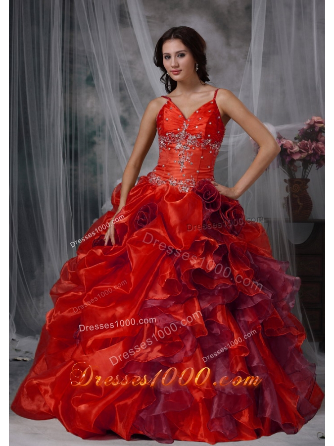 Red Spaghetti Straps Organza Beading and Ruffles Sweet Sixteen Dresses