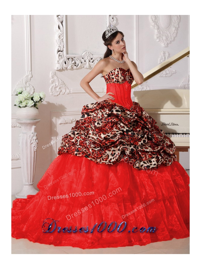 This sparkling quinceanera ball gown with a strapless sweetheart neckline,fitted bodice with clear beading trims the bust and waist.This dress creates combines a leopard print bust and top skirt with pick ups with a layered tulle skirt.What a show stopper!