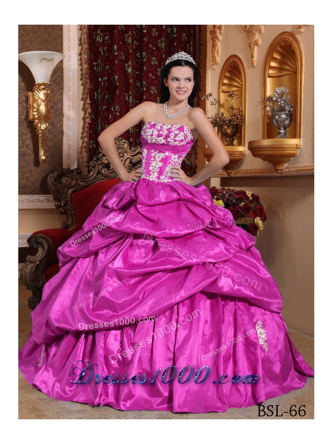 Fuchsia Ball Gown Strapless Quinceanera Dress with Taffeta Appliques