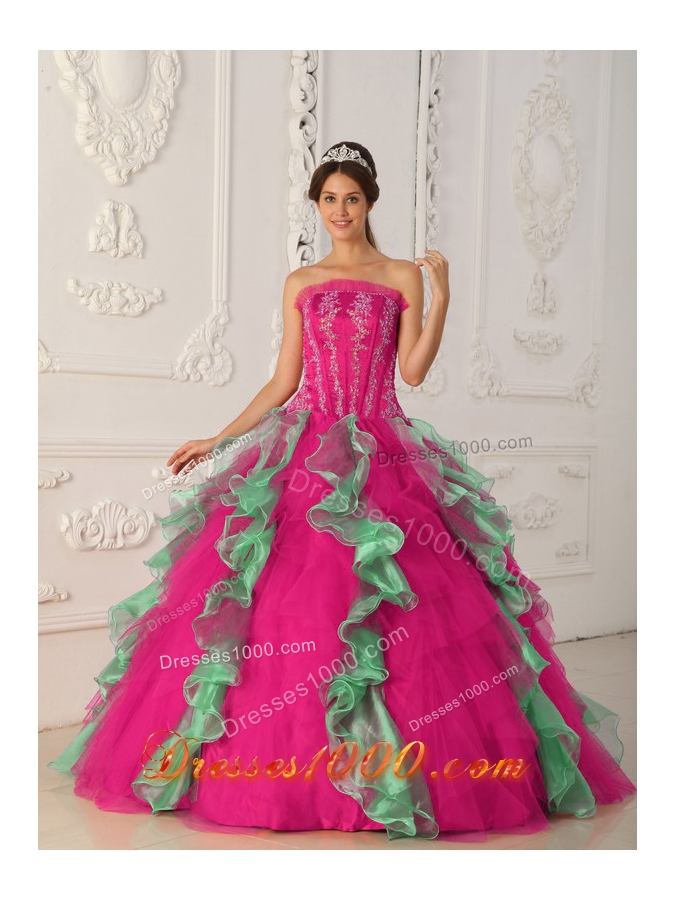 Coral Red and Green Ball Gown Strapless Quinceanera Dress with Appliques Beading
