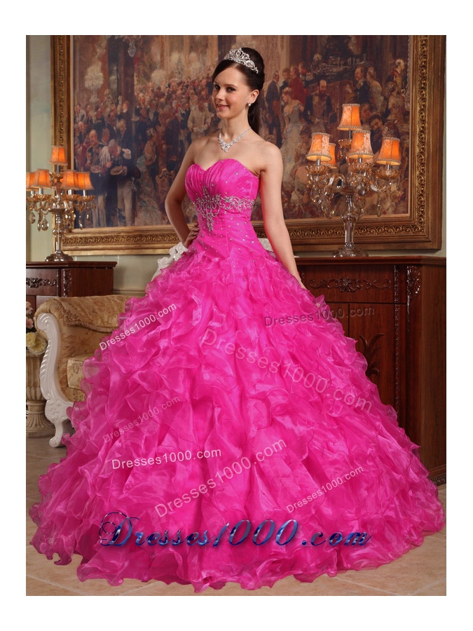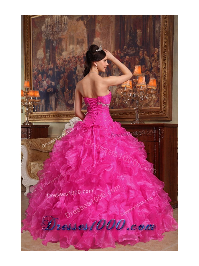 Hot Pink Ball Gown Sweetheart Quinceanera Dress with Organza Beading