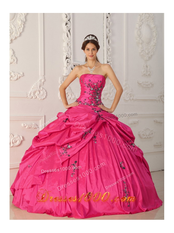 Coral Red Ball Gown Strapless Quinceanera Dress with Taffeta Appliques