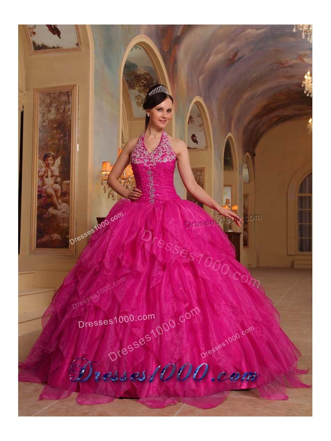 Hot Pink Ball Gown Halter Quinceanera Dress with Organza Embroidery