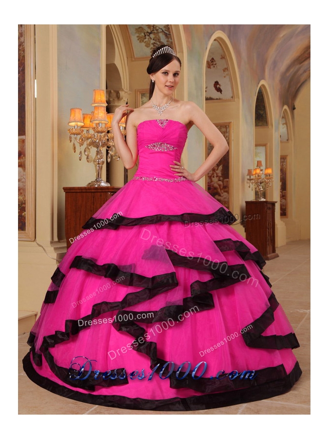 Strapless dresses are one of the sexier styles on the market today. They show just enough skin to be classy without being too revealing.This quinceanera dress features shimmering beads on the bodice and spreads around the waist, while the black trimed layers of pieced fabric add another dimension of beauty to an already lovely gown. A stunning dress for those occasions when you really want to 'wow' the crowd.