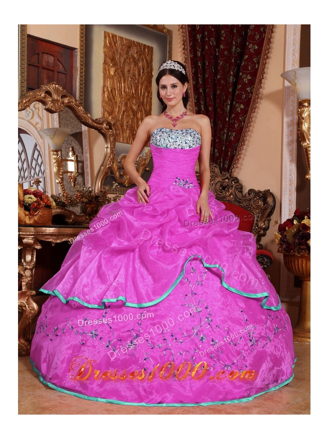 A gorgeous hot pink ball gown with contrasting turquoise trim and embroidery. The fabulous quinceanera dress pushes you in the spotlight, which features a strapless bodice with heavy embroidery on bust extending to the back and a ruching waist. The floor length skirt is full with multi-tiered ruffles and eye-catching accents scattered throughout the front and the back giving this gown an enchanting style you're sure to love. A corset-style closure completes