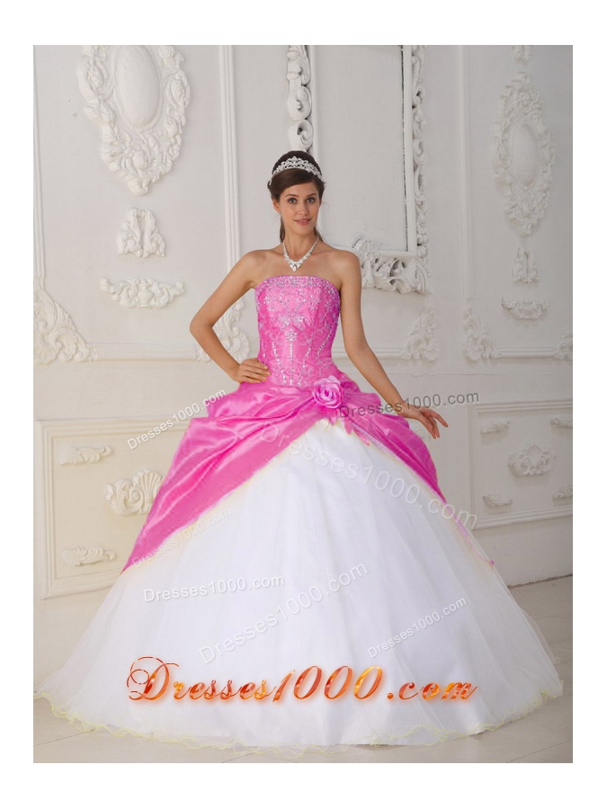 Hot Pink and White Ball Gown Strapless Quinceanera Dress with Taffeta Appliques Hand Flower