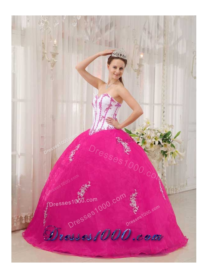 White and Hot Pink Ball Gown Sweetheart Quinceanera Dress with Taffeta Appliques