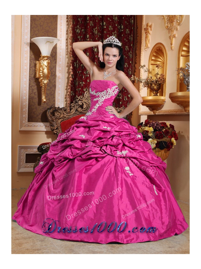 2014 Hot Pink Ball Gown Strapless Quinceanera Dress with Taffeta Appliques