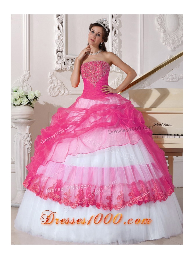 Hot Pink and White Ball Gown Strapless Long Appliques Quinceanera Dress