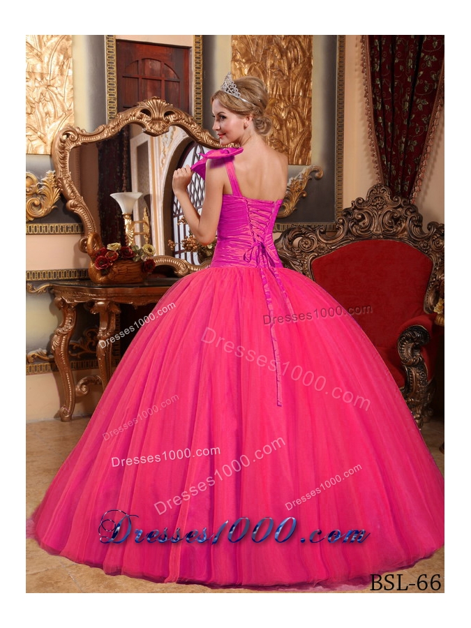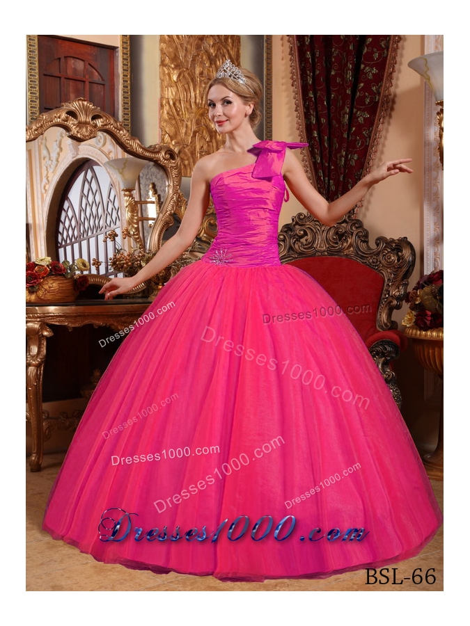 Hot Pink Ball Gown One Shoulder Quinceanera Dress with Tulle Beading