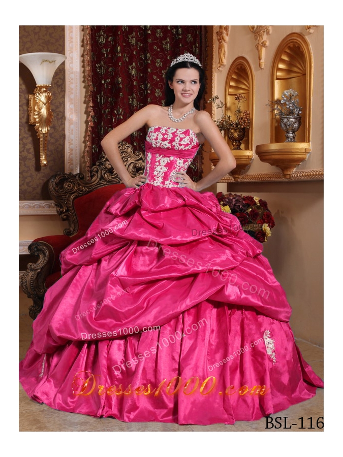 2014 Appliques Hot Pink Ball Gown Strapless Quinceanera Dress