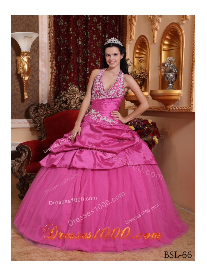 Rose Pink Ball Gown Halter Quinceanera Dress with Taffeta Appliques