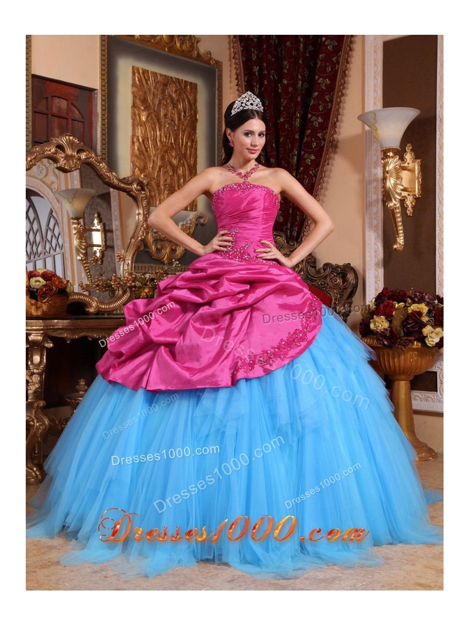 Hot Pink and Blue Ball Gown Strapless Quinceanera Dress with Appliques Beading