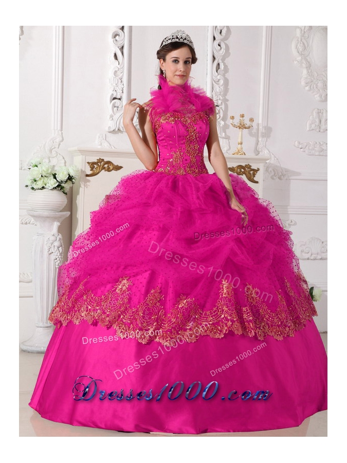 Hot Pink Ball Gown Halter Quinceanera Dress with Taffeta Beading Appliques