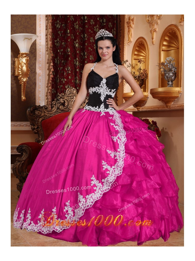 Hot Pink Ball Gown V-neck Quinceanera Dress with Taffeta Organza Appliques