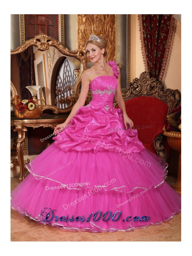 Hot Pink Ball Gown One Shoulder Quinceanera Dress with Organza Beading Pick-ups