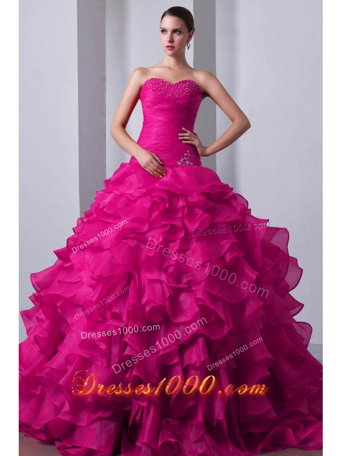 Fuchsia Princess Sweetheart Brush Train Quinceanea Dress with Organza Beading Ruffles