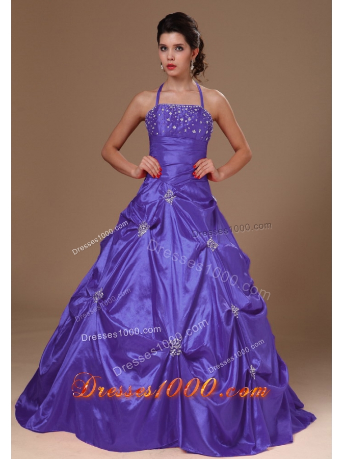 A-line Purple Halter Top Quinceanera Dress with Pick-ups and Beading