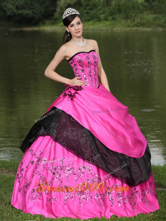 Hot Pink Strapless Appliques 2014 Puffy Spring Quinceanera Dresses