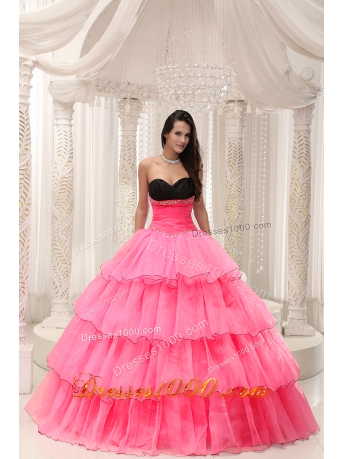 Love the dress at first sight! This brand new strapless pink quinceanera dress is accented with the black edges decorating the ruffles on the bottom of the dress immaculately. The bodice is adorned with a black ruching bust and beadsline accents on the under bustline. The sheathy bodice wrap the body to show off the figure.Lce up back fitted the dress. Heads will trun to you in this flawless quinceanera dress.