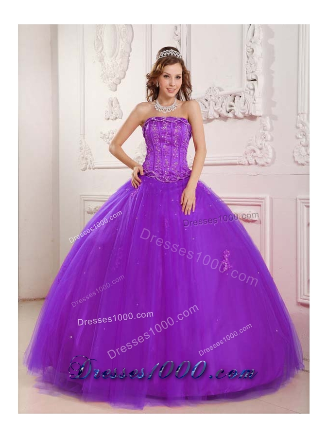 Elegant Strapless Tulle Purple Quinceneara Dresses with Appliques and Beading