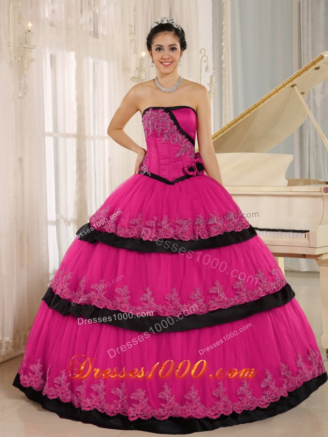 Wonderful work of handmade flowers and applique. You are the spotlight of the ball when you walk into the party in this dress. It features a strapless bodice with straight neckline in the delicate flowers and applique. It's a perfect design of Coral Red and black. The popular lace up back completes the look. This floor-length quinceanera dress will sure to dance the night away.