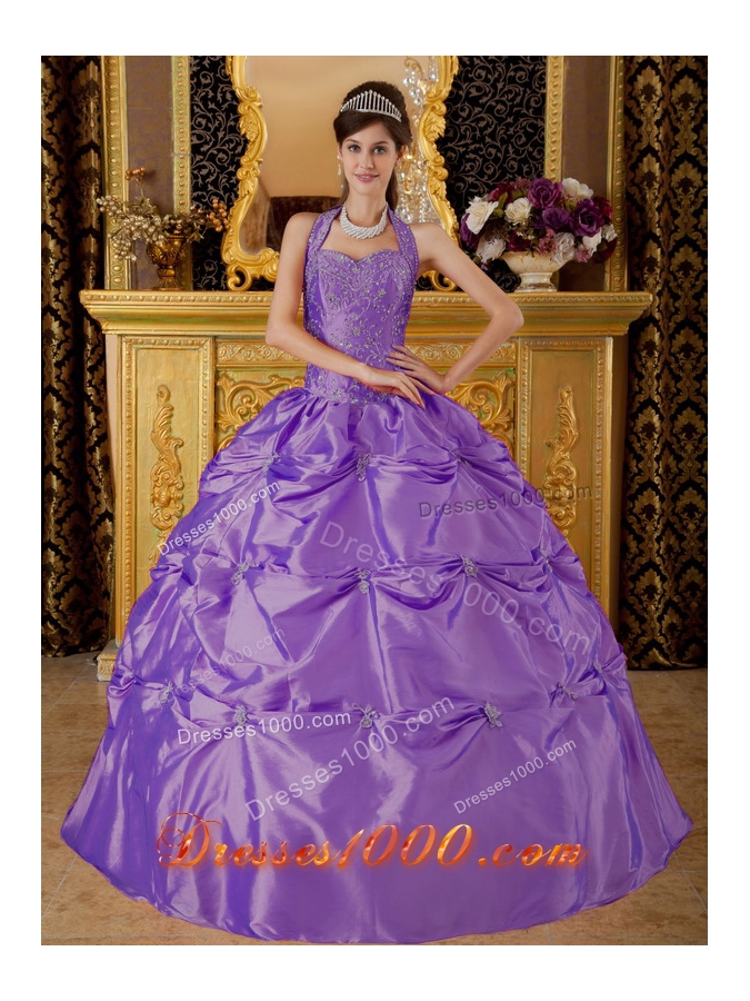 Discount Ball Gown Halter Tafftea Appliques For Purple Quinceanera Gowns
