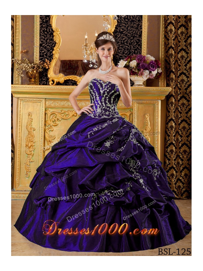 Purple Sweetheart Taffeta Quincenera Dresses with Appliques and Pick-ups