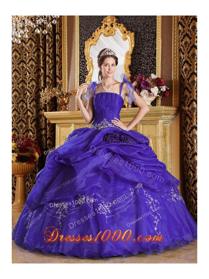 Purple Straps Appliques Quinceanera Dress with Hand Made Flowers and Pick-ups